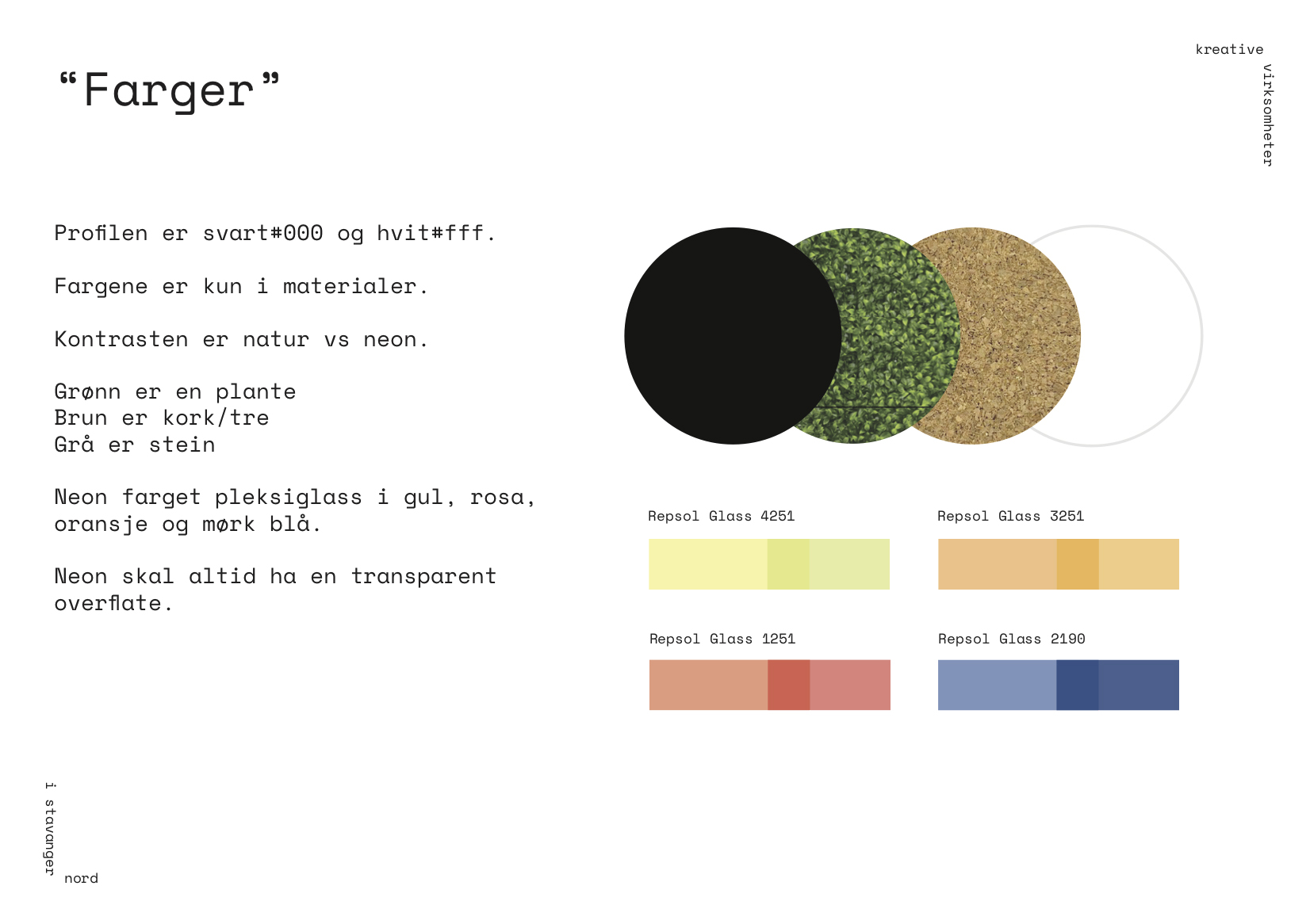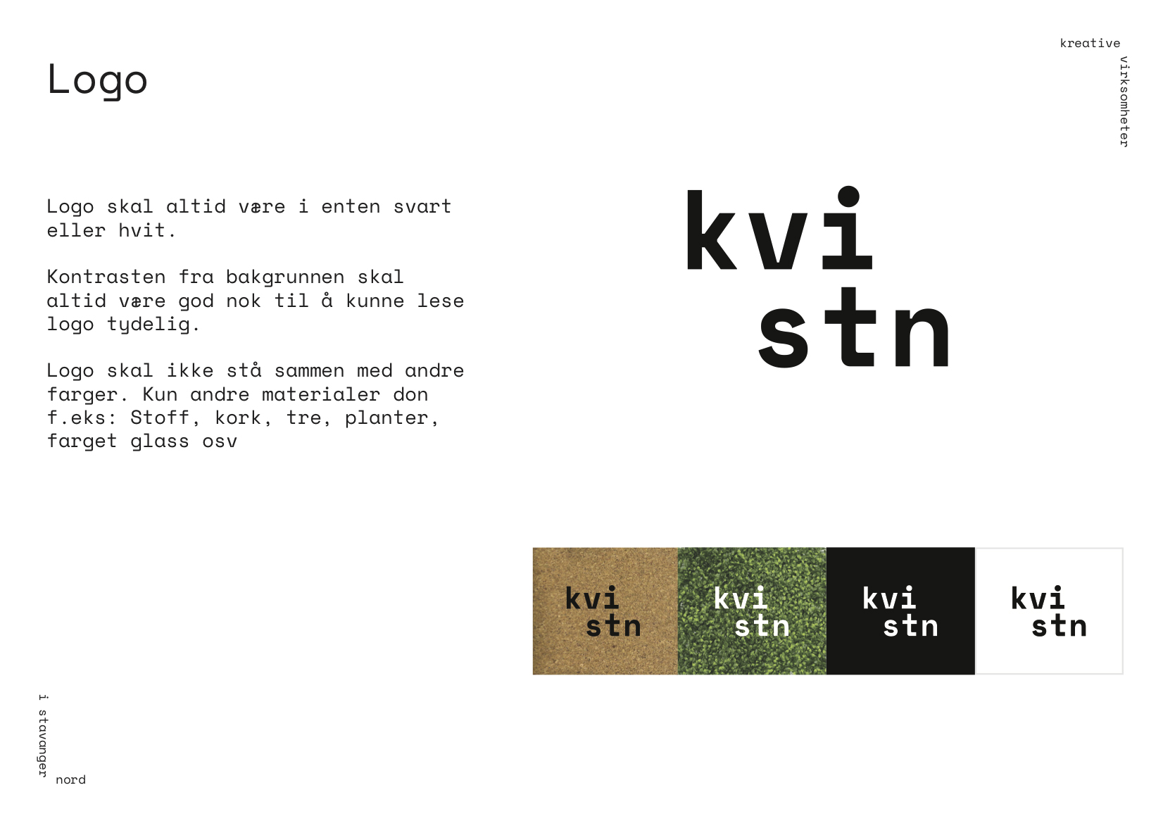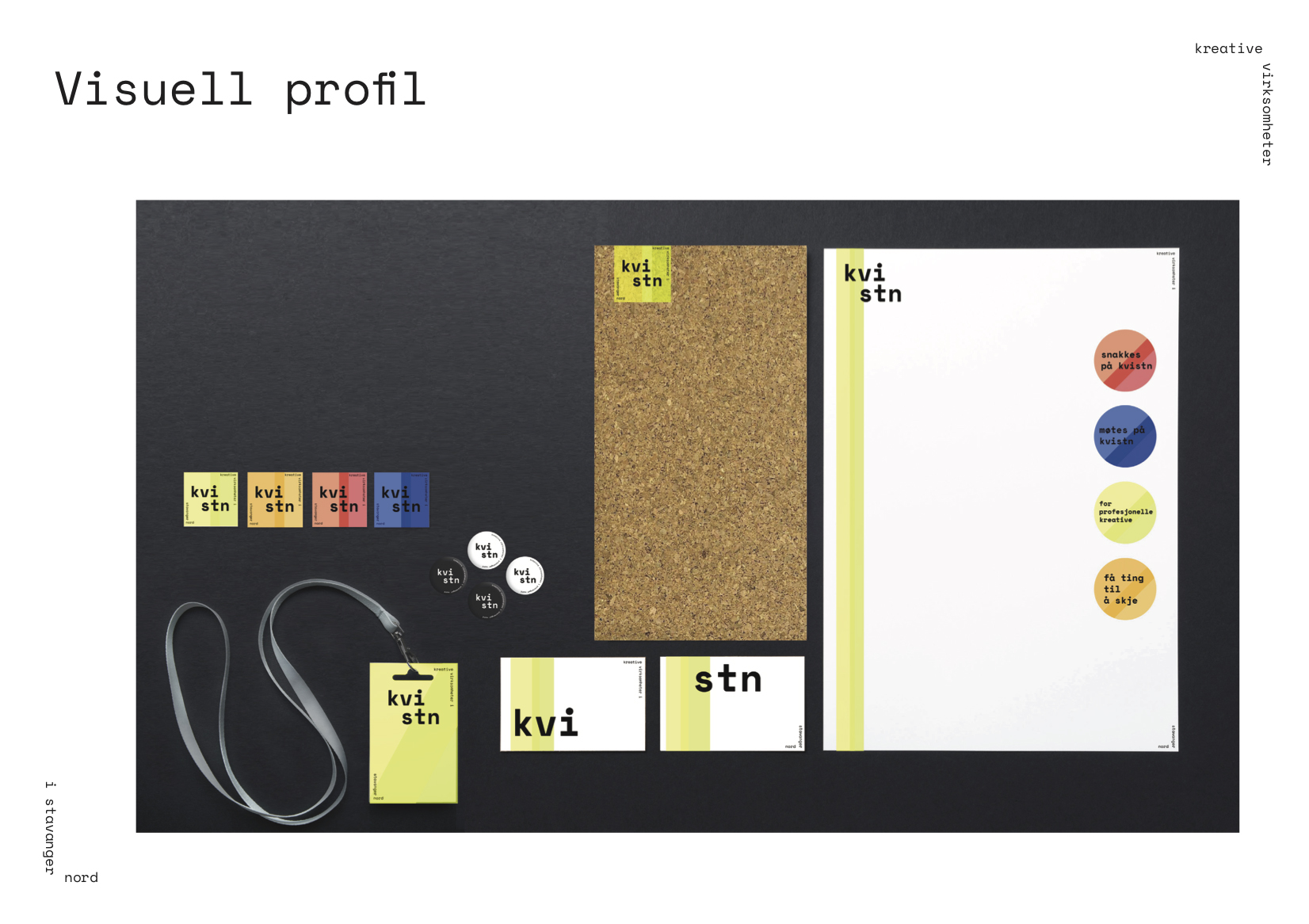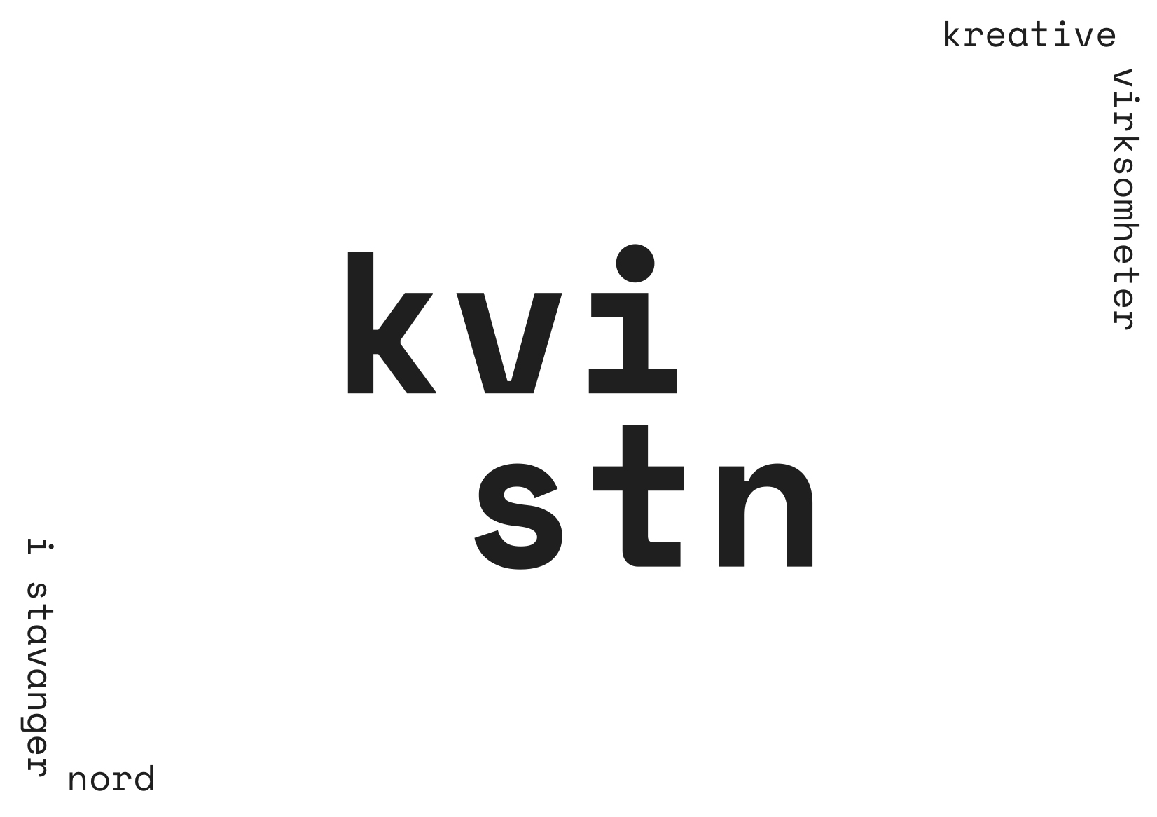 Kvistn - Kreative virksomheter i Stavanger Nord. Navnet er et lett omskrevet «kvisten» - greina som går sine egne veier, det lille rommet hvor man kan sitte og tenke og forbokstavene i beskrivelsen: Kreative Virksomheter I STavanger Nord. Innredningen bygger på arealer som skal vekke kreative krefter i både form, farge og funksjon. Profilen er bygget på grafiske rene og rette linjer. Dette tas ut i logo, font og ikoner. Kontrastene er harde med svart og hvitt og mykes opp med ulike materialer. Selve materialene utgjør fargene i profilen. Her brukes materialene aktivt, som mose, kork, stein og stoff. I tillegg ble det tatt i bruk transparente flater i fargene gult, rosa, oransje og blått.